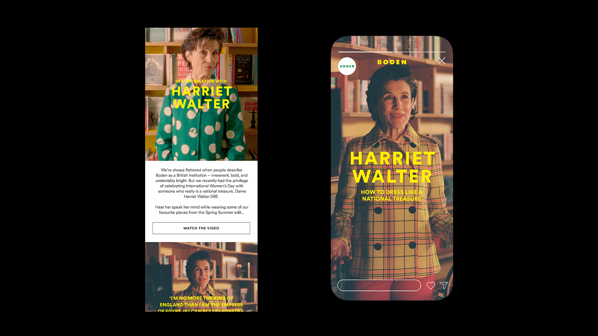 I was briefed for International Womens Day to deliver the creative assets for Boden’s collaboration with Dame Harriet Walter. Working closely with the video agency and copywriters, I lead and managed the rollout across the website, paid and organic social and email marketing.
